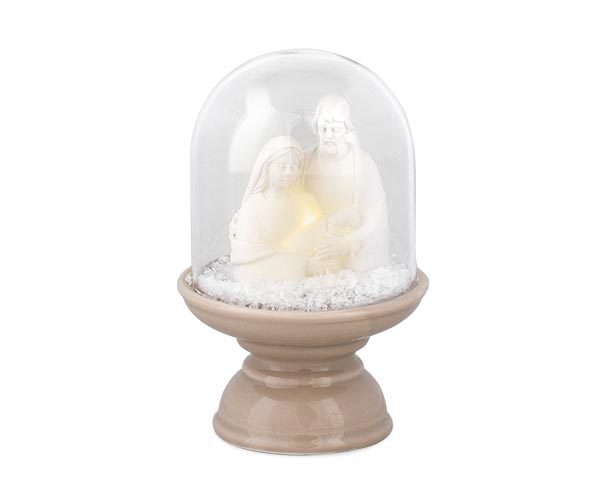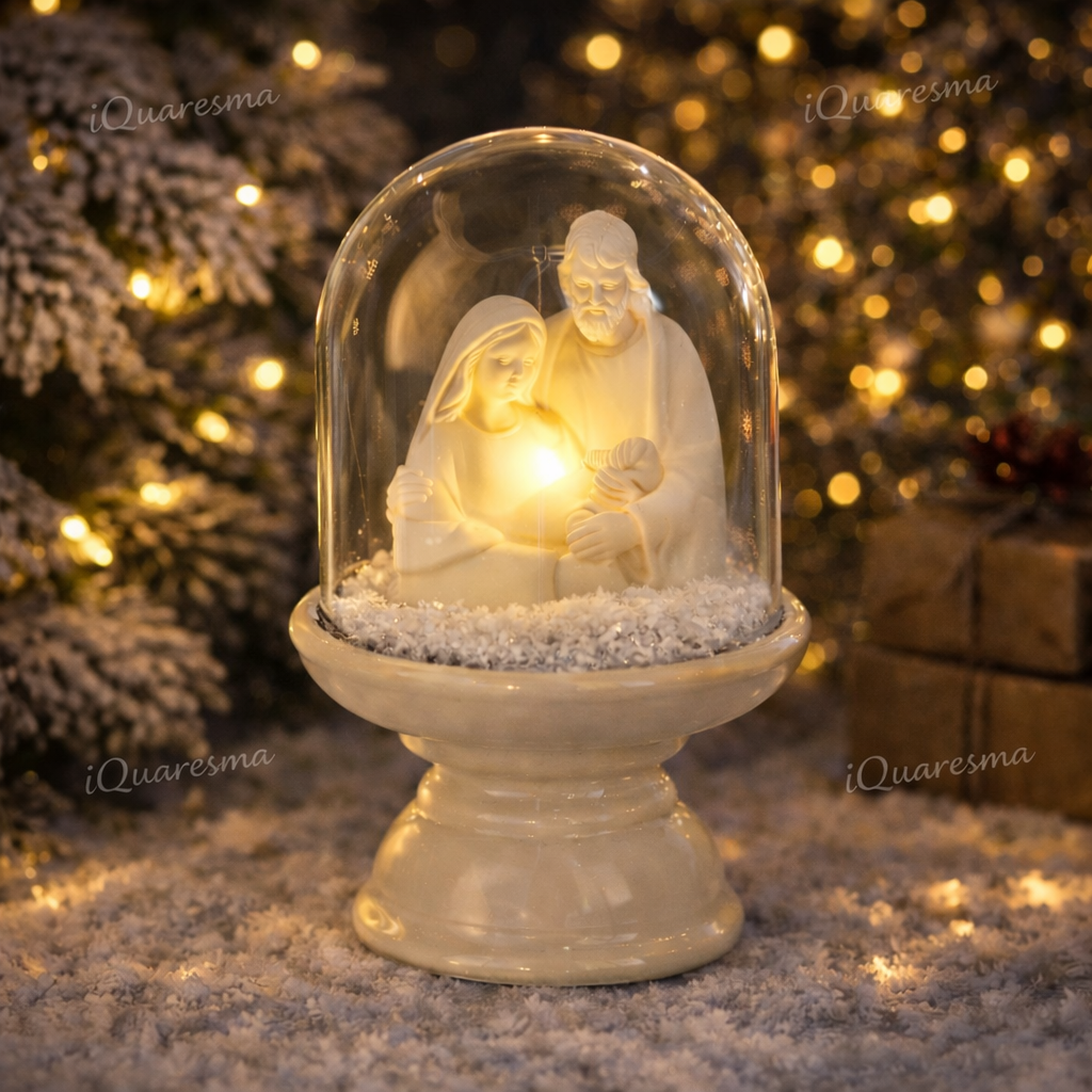 Presépio em cerâmica biscuit, dentro de uma campânula de vidro com base em cerâmica.