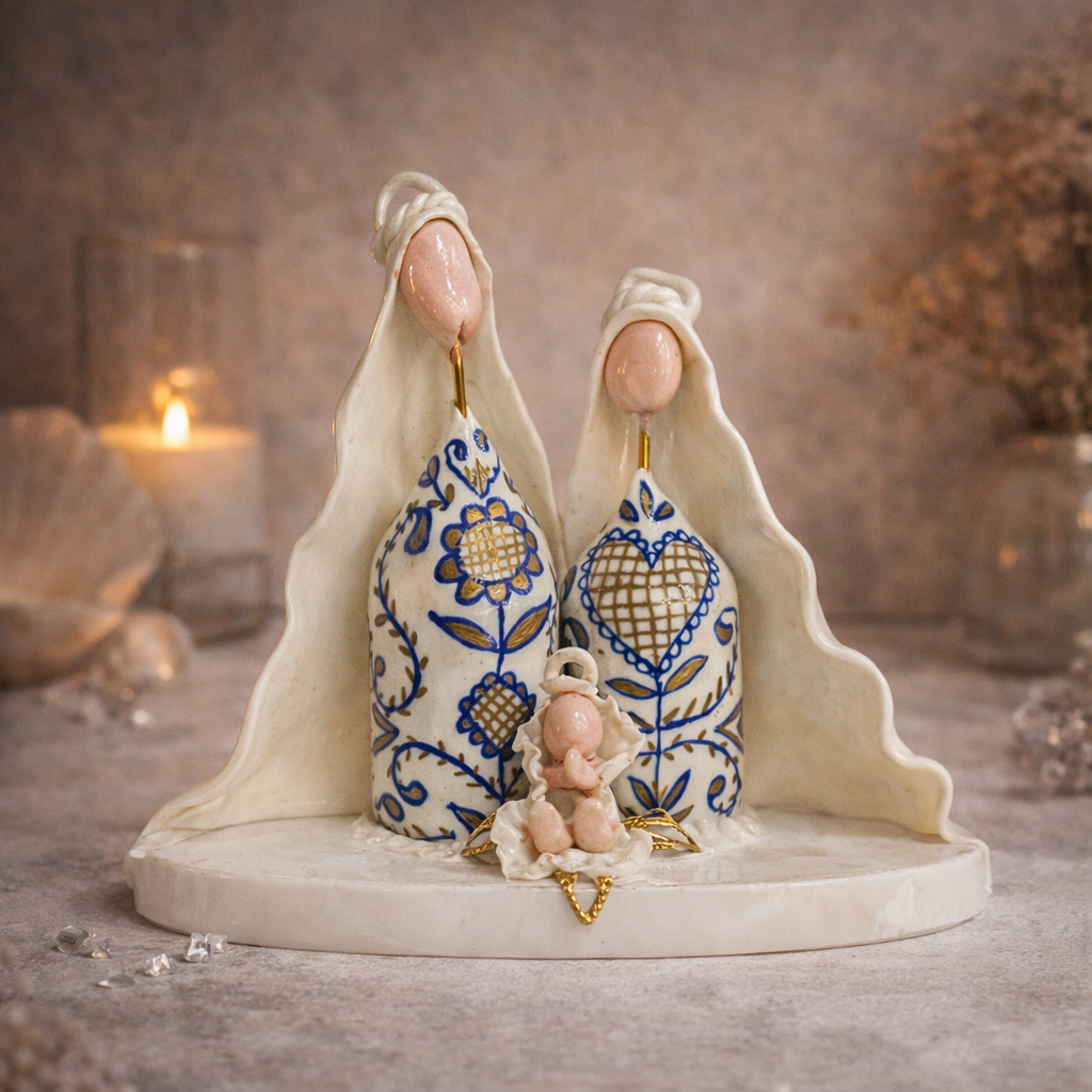 Presépio super fofo e delicado, é uma peça única, moldada em porcelana fria, ilustrada e pintada à mão
