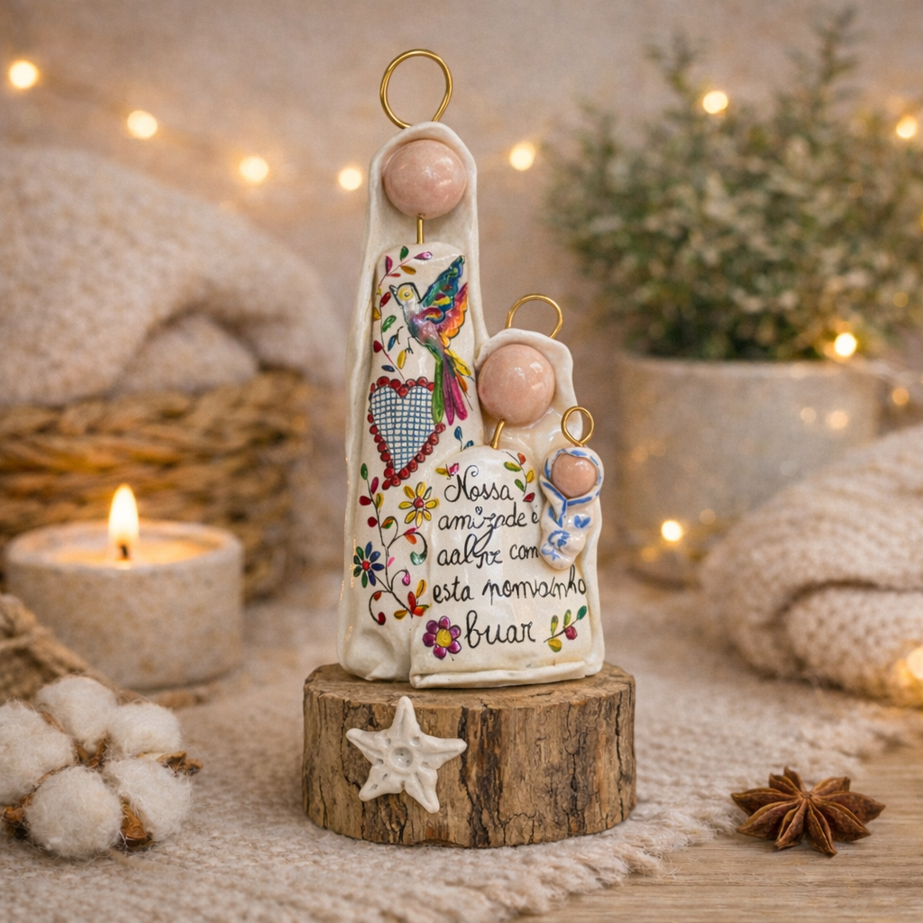 Presépio super fofo e delicado, é uma peça única, moldada em porcelana fria, ilustrada e pintada à mão