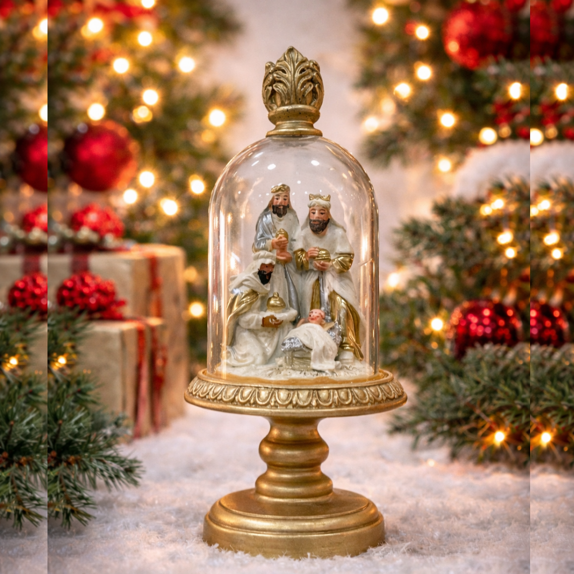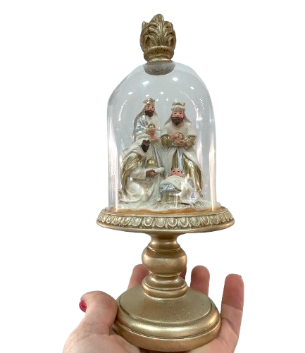 Linda Redoma em vidro, com base dorada e reis Magos a adorar o menino no interior...