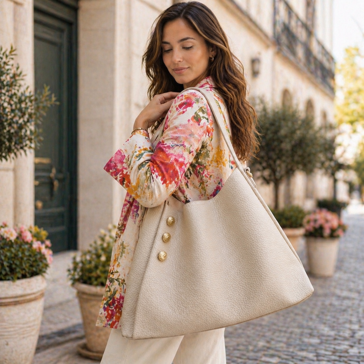 Com um design moderno e feminino, esta mala destaca-se pelo seu tom neutro e detalhes dourados sofisticados. Espaçosa e prática, é perfeita para o dia a dia, adaptando-se facilmente a diferentes estilos e ocasiões.