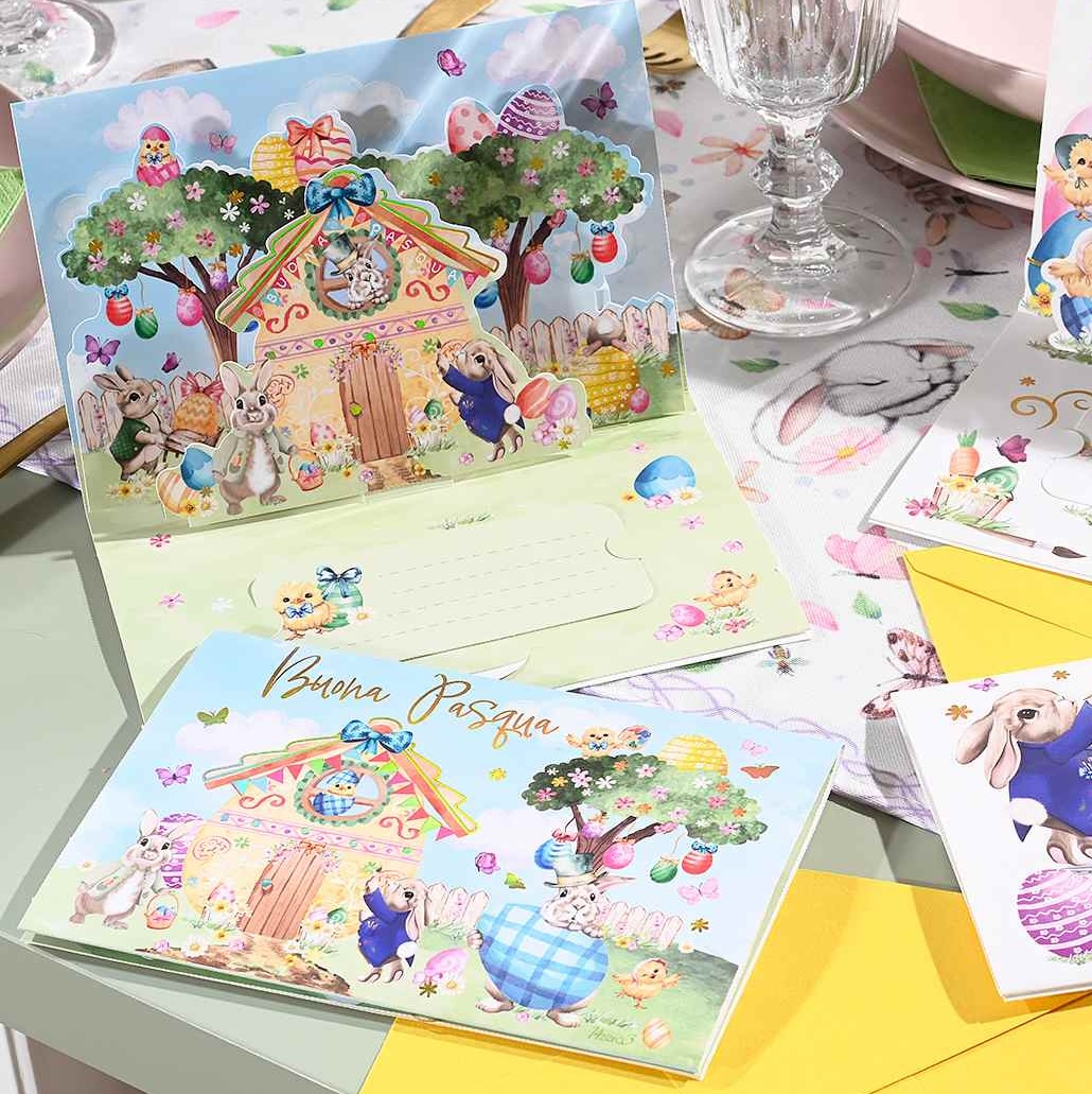 Cartões de Páscoa com elementos pop-up e envelopes para escrever.