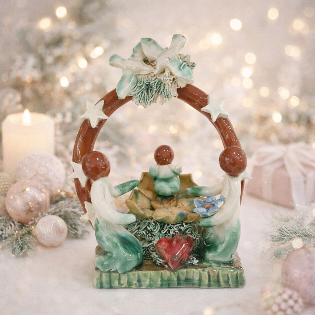 Presépio super fofo e delicado, é uma peça única, moldada em barro, e vidrada.