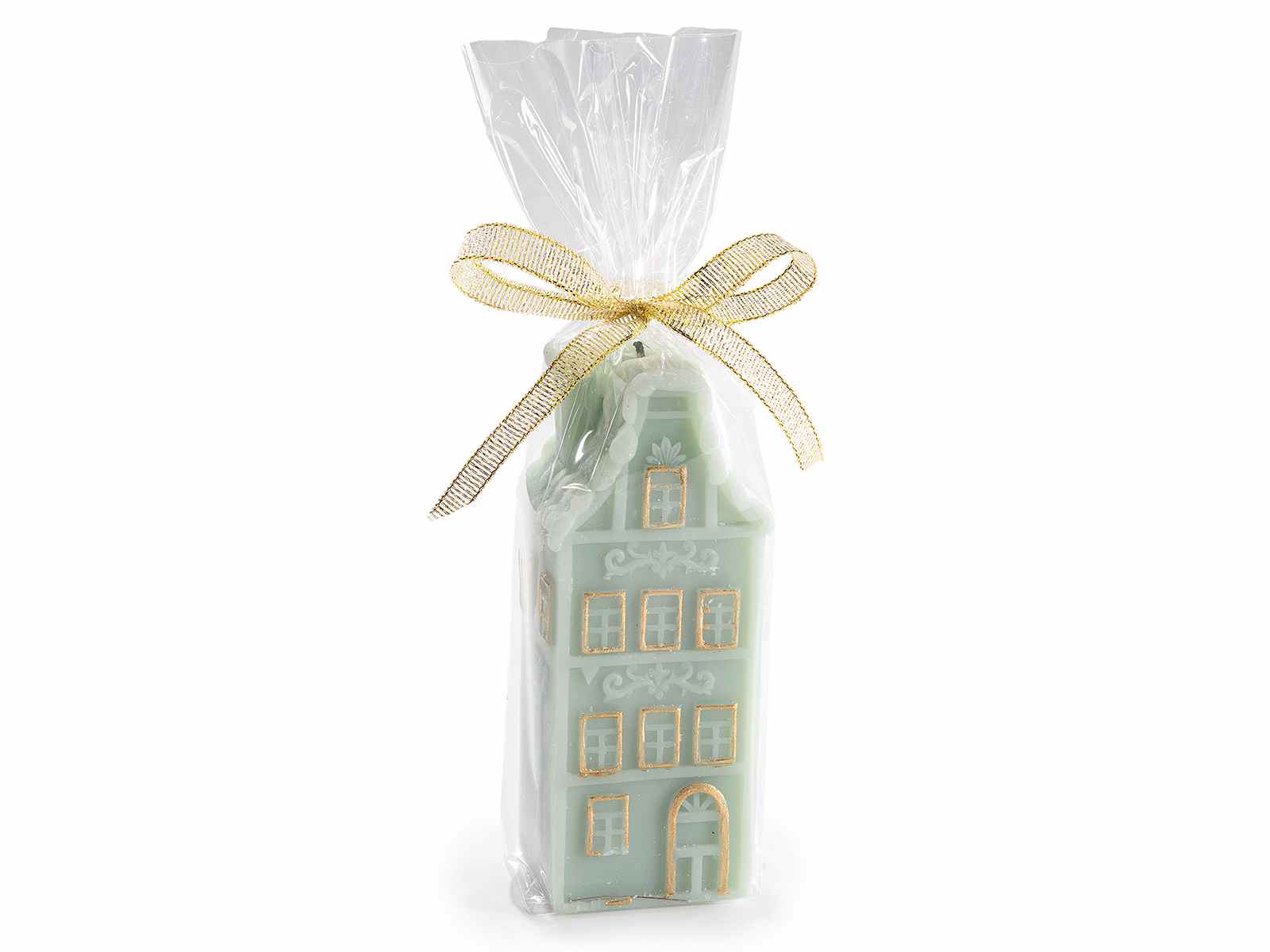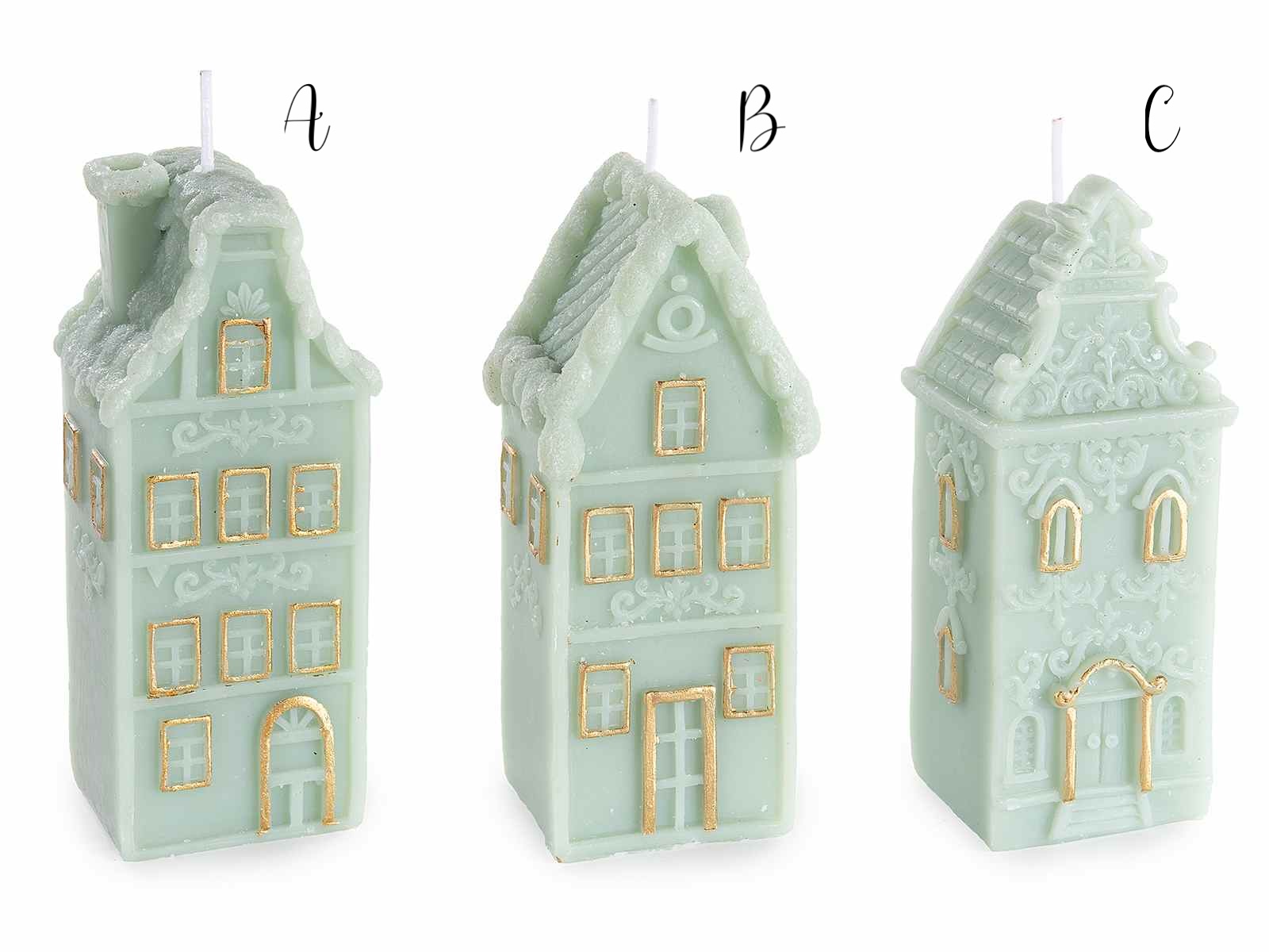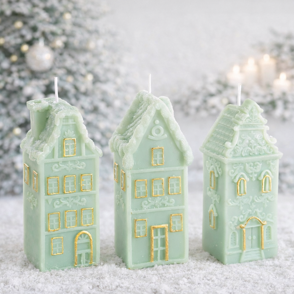 Velas em formato de casa com decorações em relevo e detalhes em dourado.