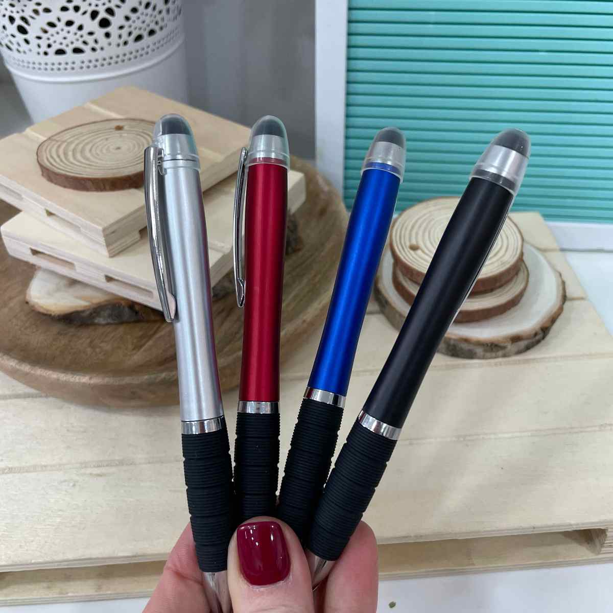 Esferográfica com luz LED interior. Escrita preta, sistema twist. Este led tem botão de ligar-desligar, que funciona como touch