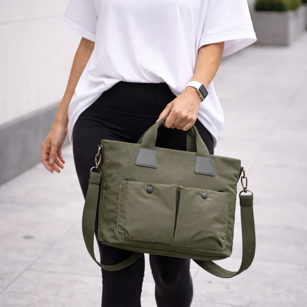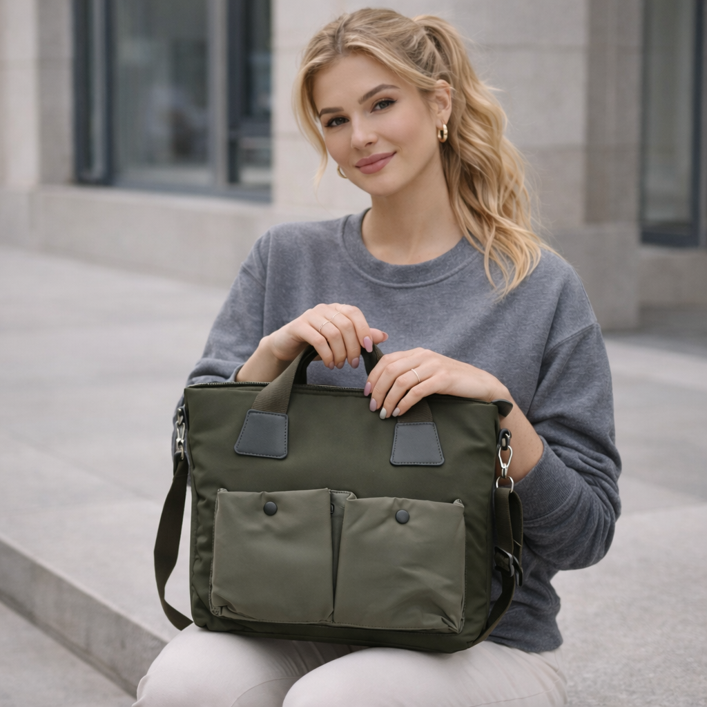 Moderna e funcional, esta mala verde destaca-se pelo seu design prático e contemporâneo. Conta com bolsos frontais para fácil acesso aos essenciais e alças confortáveis, ideais para o uso diário. Versátil e leve, é perfeita para acompanhar looks casuais, urbanos ou de trabalho.