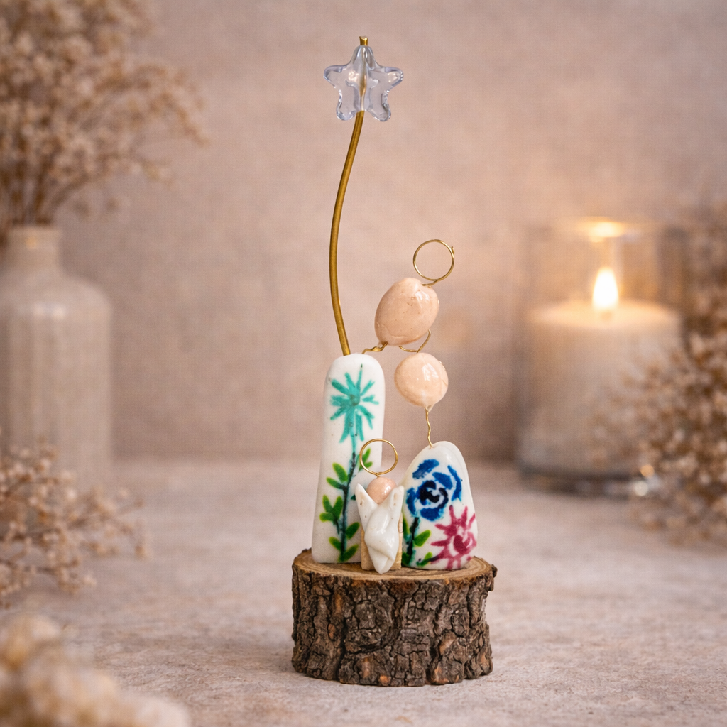 Presépio super fofo e delicado, é uma peça única, moldada em porcelana fria, ilustrada e pintada à mão