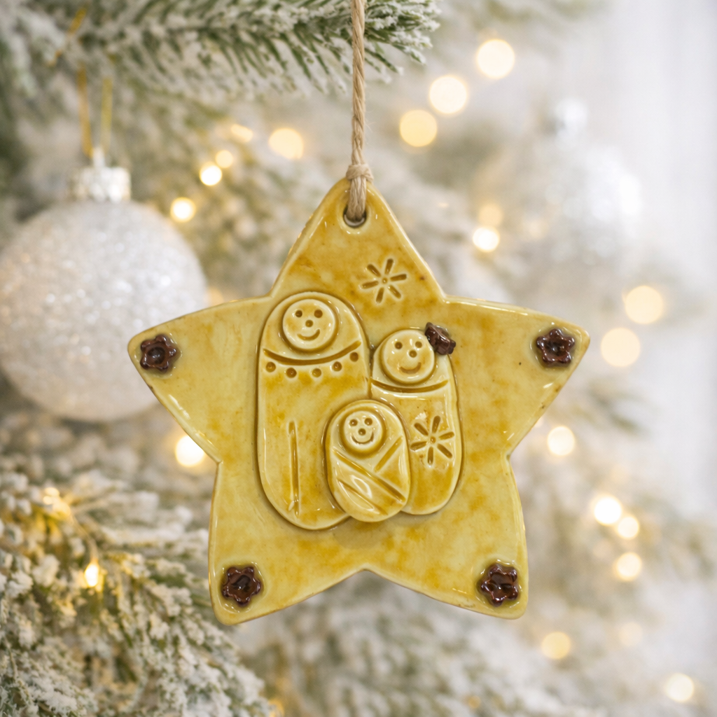 Pendente Estrela c/ Presépio super fofo e delicado, é uma peça especial, modelada em barro, e vidrada.