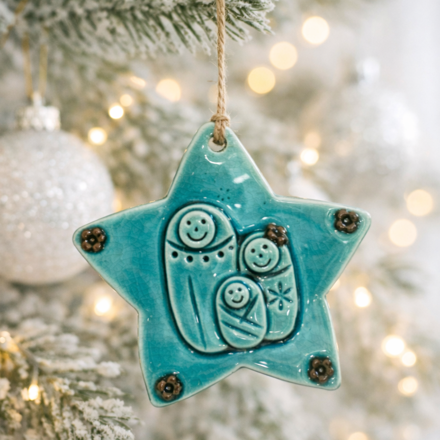 Pendente Estrela c/ Presépio super fofo e delicado, é uma peça especial, modelada em barro, e vidrada.