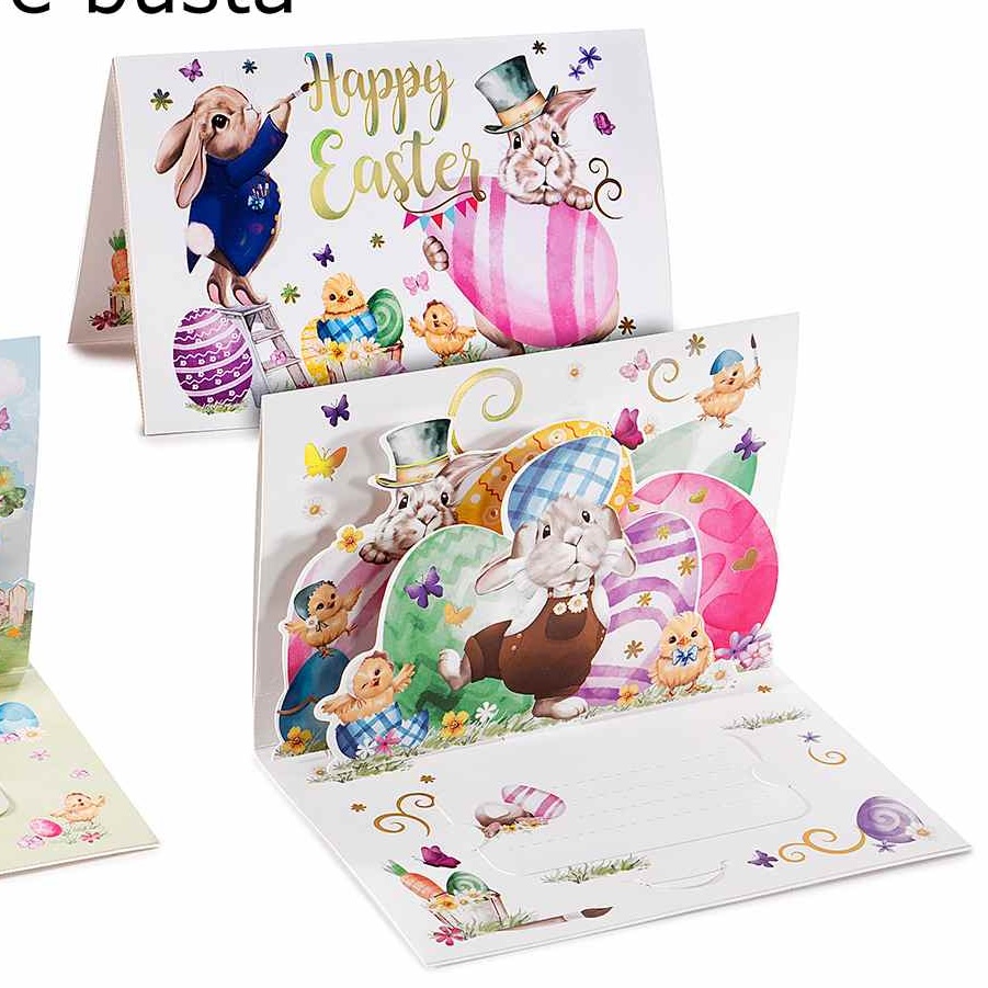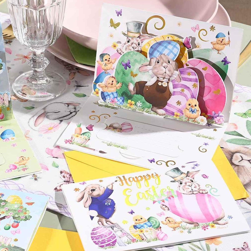 Cartões de Páscoa com elementos pop-up e envelopes para escrever.