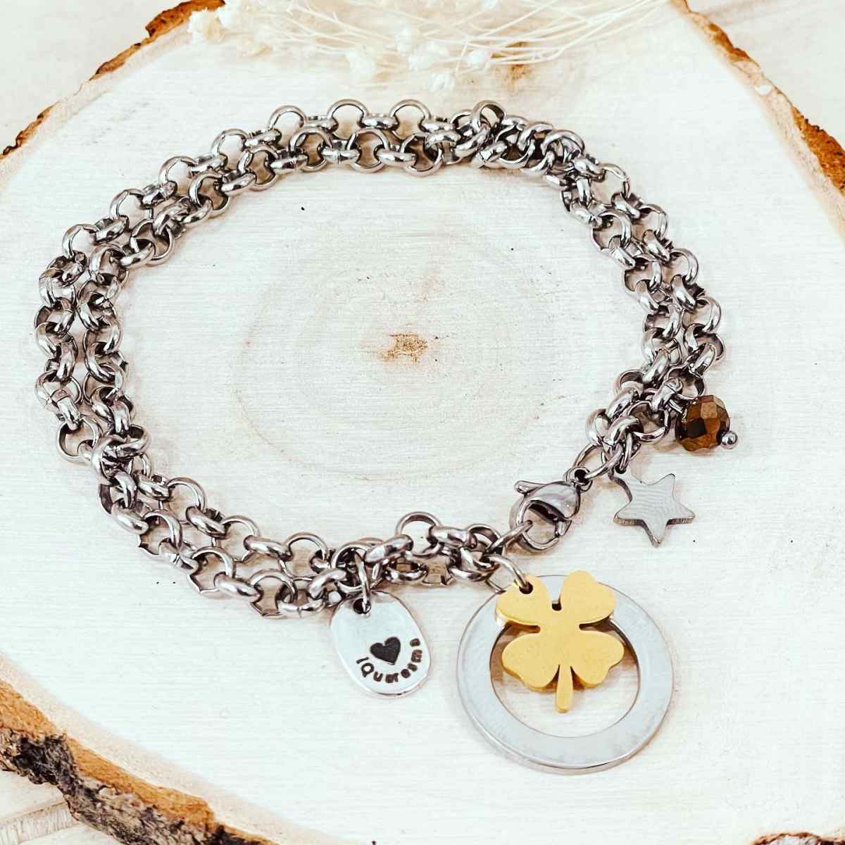 Pulseira Malha dupla em aço inoxidável com trevo.